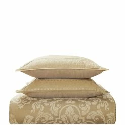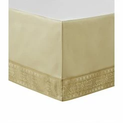 - The four-piece set includes a comforter, two pillow shams, and a tan box pleat bed skirt trimmed with a jacquard border
