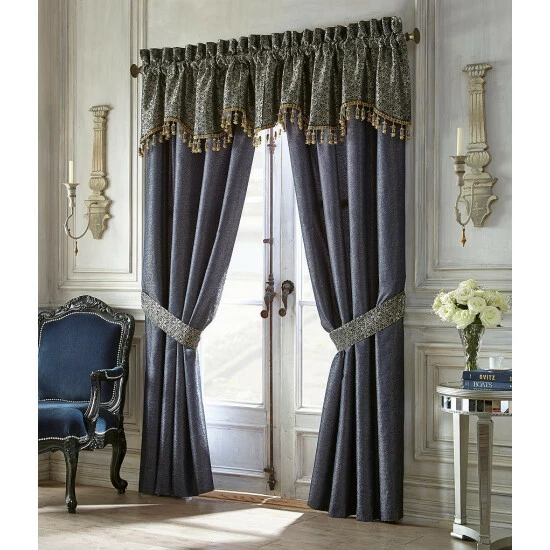 - Scalloped valance features an allover scroll with decorative ball fringe